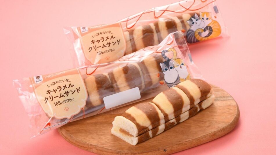 2月10日(火)よりファミリーマートから、ミルク風味の生地とキャラメル風味の生地でしましま模様のしっぽに見立てたパンに、キャラメルクリームをサンドした「しっぽみたいなキャラメルクリームサンド」が新発売されます✨