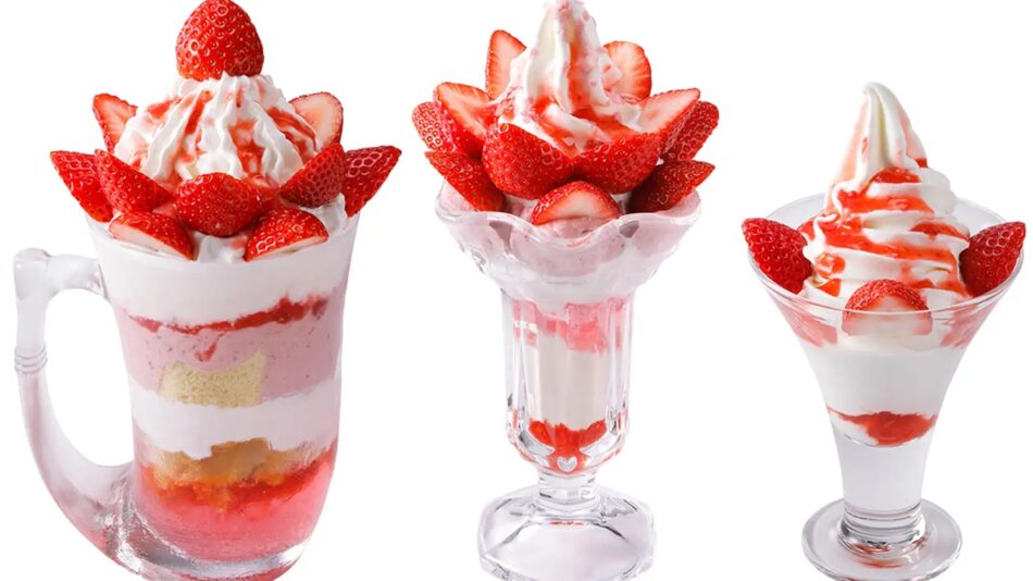 1月21日(水)よりびっくりドンキーから、国産完熟いちごをふんだんに使用した「ジョッキパフェ(完熟いちご)」、「完熟いちごパフェ」、「完熟いちごサンデー」などいちごデザート4種が発売されます✨