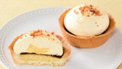 …バニラ香るホワイトクッキークランブルムースに香ばしいアーモンドプラリネを重ね、月の形のダークチョコレートで包み込んでいます。