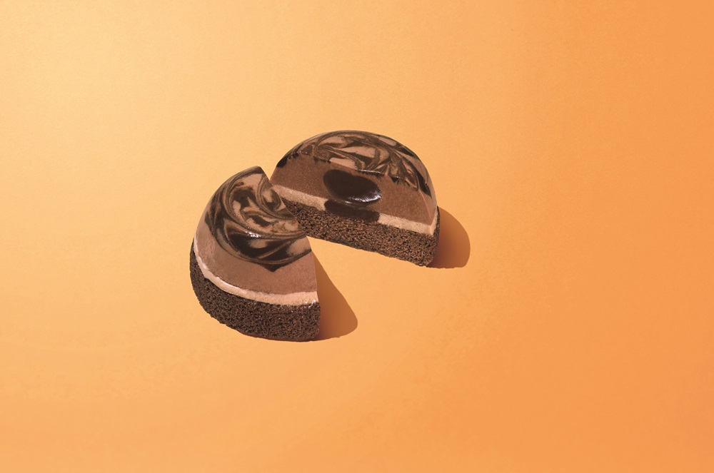…ガトーショコラ生地の上にチョコホイップを円状に絞り、真ん中にチョコガナッシュを絞った土台に、マーブル模様が特徴的なドーム型のチョコムースを乗せ、ムースの中にはとろ~り濃厚なチョコソースが入っています。