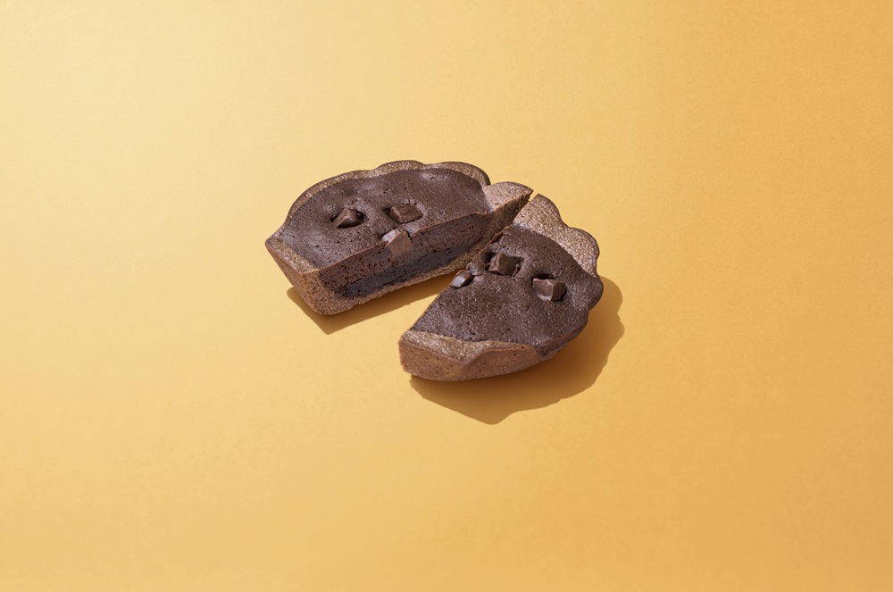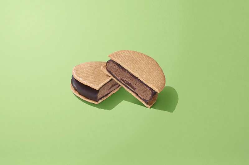 …中心にほんのりビターな味わいのチョコソースが入ったチョコクリームをパリっと食感のチョココーティングで覆い、サクっと食感のビスケット生地でサンドしています。