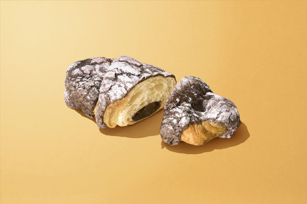 …チョコクリームとチョコダイスを巻き込んだクロワッサンに、チョコマカロン生地を絞って焼き上げた、サクッとした食感とチョコの味わいが楽しめるスイーツパンです。