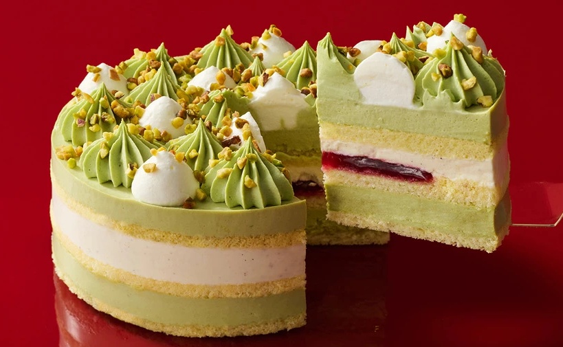 シャンティ、ムース、トッピングにと、ピスタチオをふんだんに盛り込んだXmas限定のケーキです!グリオットのさわやかな酸味を感じられるムースが、 味にも見た目にもアクセントを生み出しています!