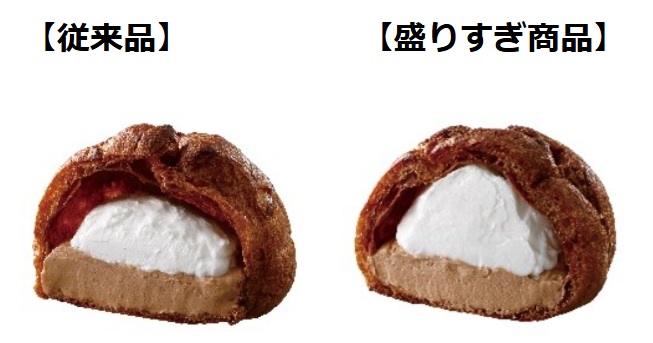 …従来品「大きなチョコシュー」と比較して、クリーム(チョコクリームとホイップクリーム)を約50%増やしました。香りの良いチョコクリームとホイップクリームを入れた2層仕立てのシュークリームです。
