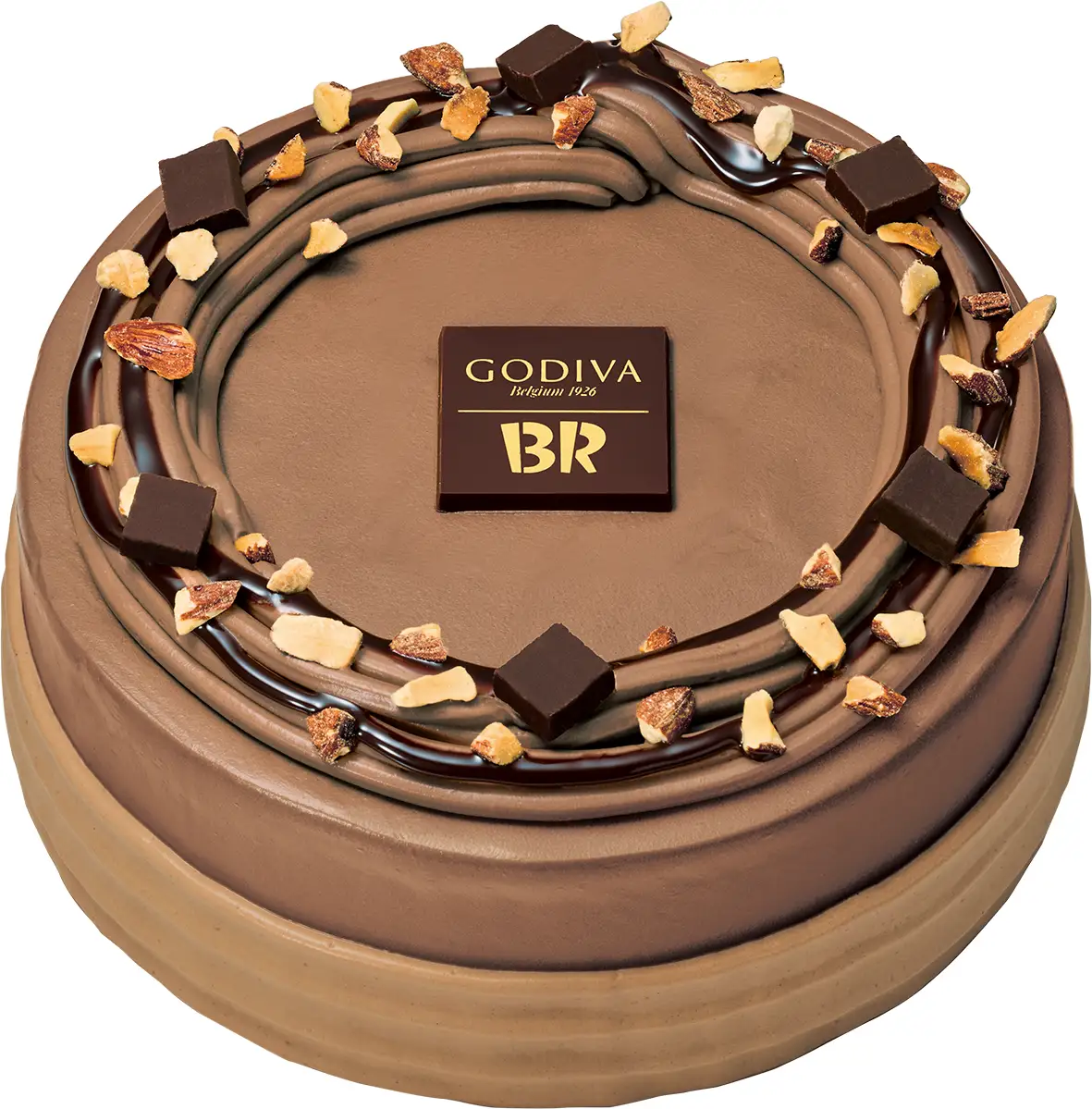 …「- ゴディバ監修 – マリアージュ デュ ショコラ」がエレガントなアイスクリームケーキに!アイスクリームをライトブラウンとダークブラウンの2色のチョコレートホイップでデコレーションし、アーモンドやハイカカオチョコレート、チョコレートソースをトッピングし、ロゴ入りチョコレートを飾っています。