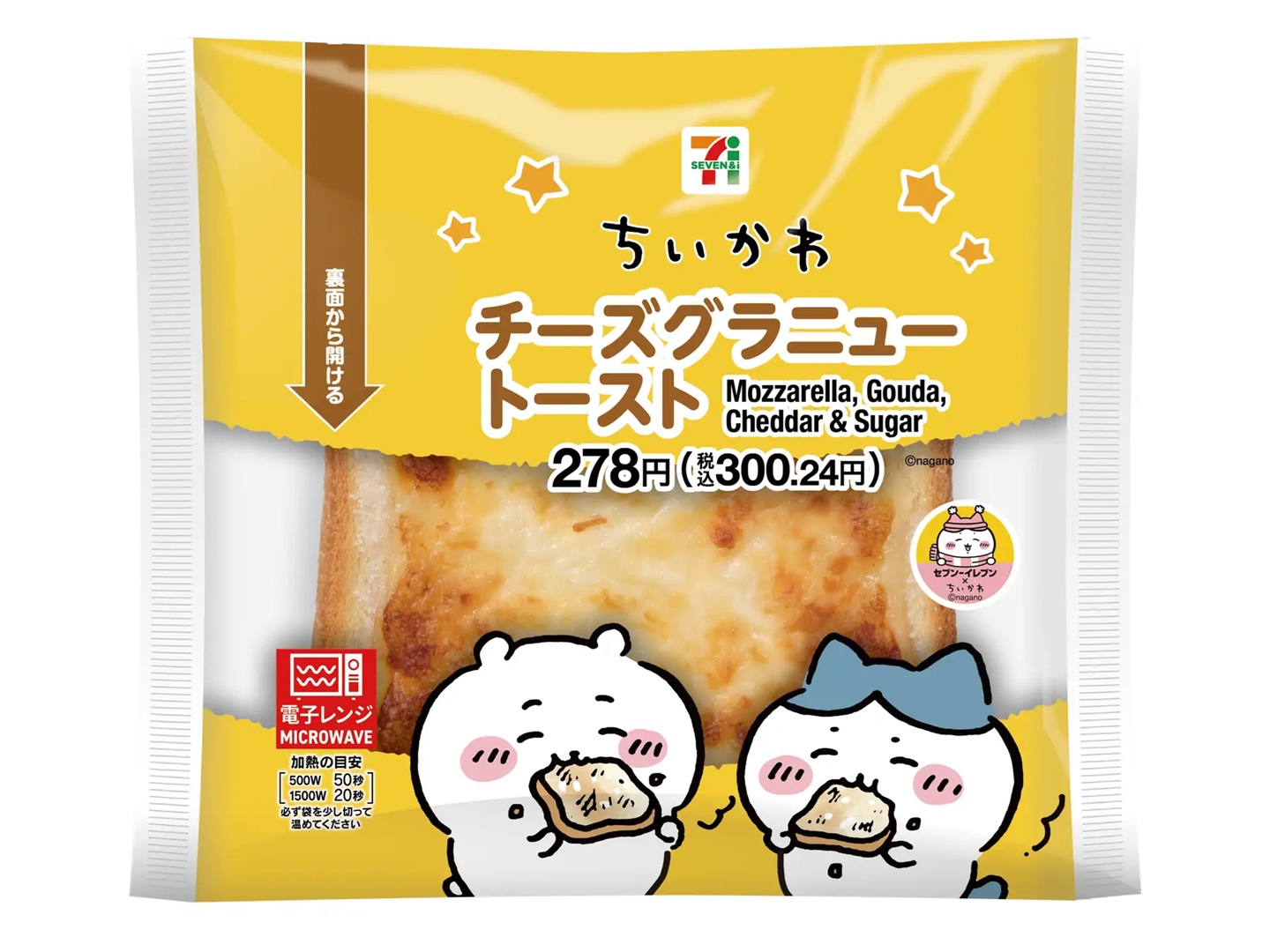 …ちいかわとハチワレが食べていたグラニュートーストにチーズをのせてアレンジ。チーズ×グラニュー糖の甘じょっぱさがくせになる商品です。