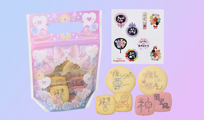 …推しへの想いを表現した手書き風の【推し文字】をプリントしたクッキーと、ケーキに飾れるピックシートのセットです。推しカラーのケーキに自由にデコレーションして、推しへの愛を表現して楽しめます。推しの誕生日や記念日、クリスマスにもおすすめです。