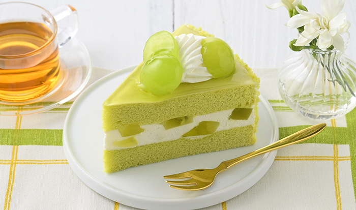 …ジューシーな果肉と上品な甘み&香りが特長の旬の果実「シャインマスカット」を楽しむ季節限定のショートケーキです。マスカットと相性のいいヨーグルト風味クリーム(マスカットゼリー入り)をマスカット風味スポンジでサンドし、上面にシャインマスカットを飾りました。