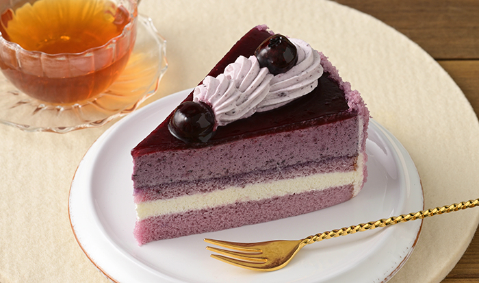 …コクのあるチーズ風味クリームと、ほんのり甘ずっぱいブルーベリームースを重ねて、ブルーベリーグラサージュ&ブルーベリークリームで仕上げています。芳醇なブルーベリーを楽しめる、あと味の爽やかなムースケーキです。