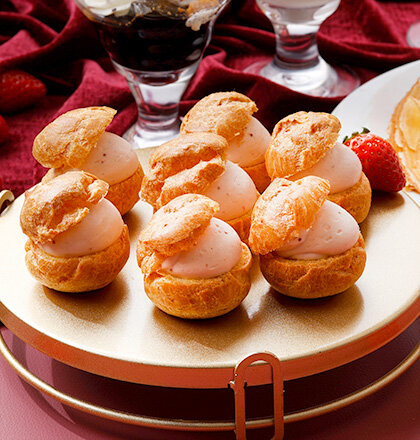 …シュークリームは、焼き立ての香ばしい生地に、カスタードクリーム、または季節のカスタードクリームをその場で注入。できたてならではのサクサク感とクリームの濃厚な味わいを存分に味わえます。