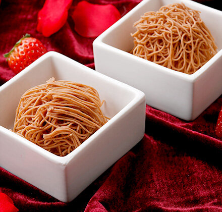 …料理長特製、目の前で絞り出すライブフレッシュモンブランは絹糸の様な細さで絞り出すことで、口の中でとろけるエアリーな食感を生み出します。搾りたてのクリーミーなおいしさは時間をおかずに食べるとより美味しいです。