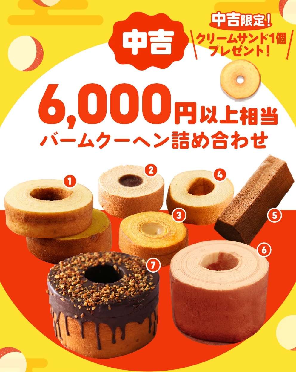 一番下の中吉でも、下町バームクーヘン×2、あんこバームクーヘン×1、フルーツあんこバームクーヘン×1、リキュールバームクーヘン×1、スティッククーヘン×1、スーパージャンボクーヘン×1、チョコがけスーパージャンボクーヘン×1の7種8個6000円以上の商品にクリームサンドもついてきます!