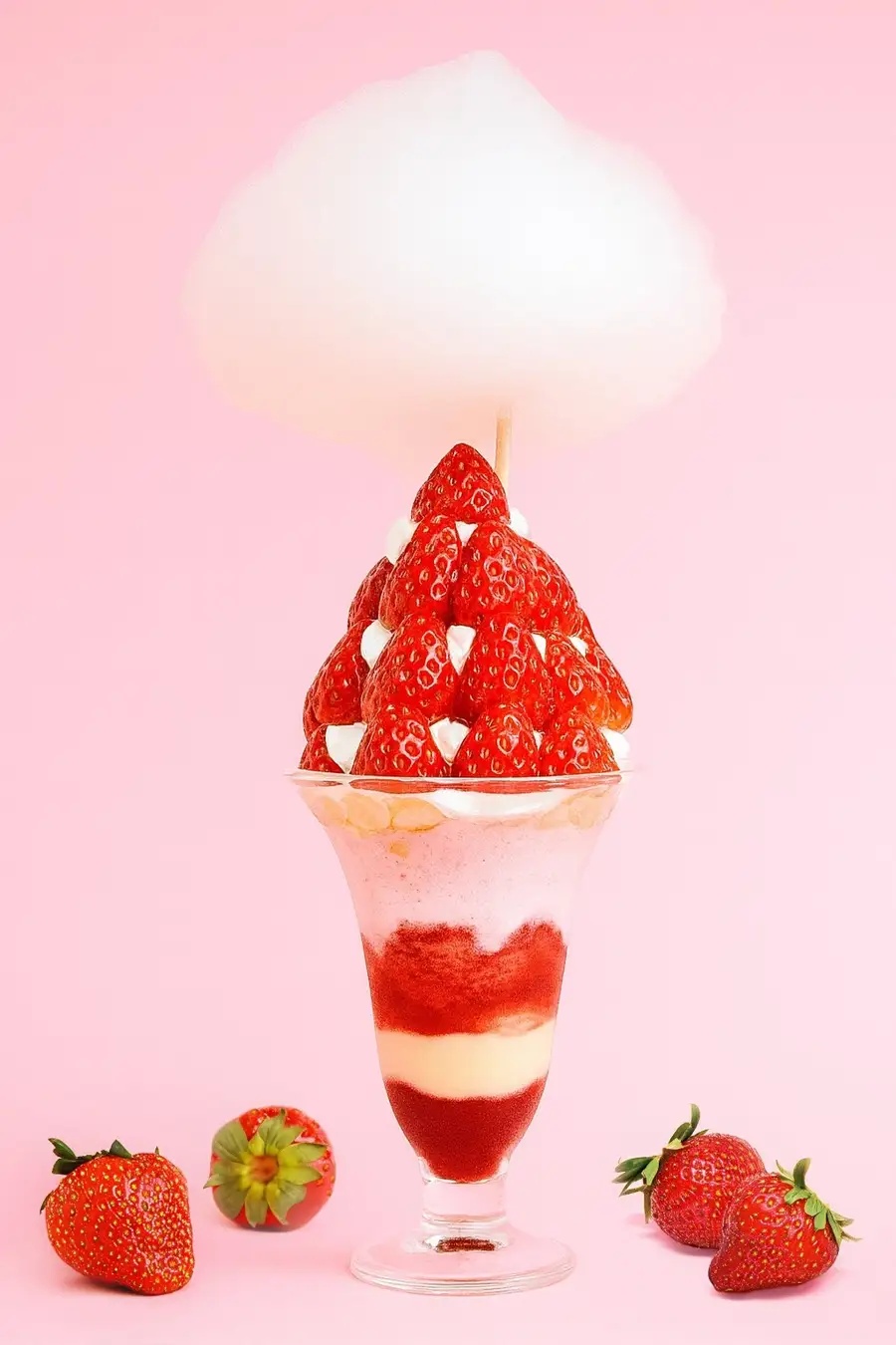 異なる品種のいちごを贅沢に使用した“いちご尽くし”のパフェ。中には自家製苺ソース、苺ムース、上にはフレッシュ苺を山のように積み重ね、ふんわりホイップで彩りました。大きな綿飴をトッピングし、見た目も味わいも忘れられない一品です。