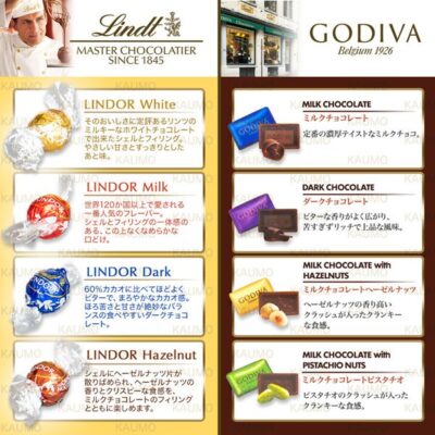 リンドールは、ミルク、ホワイト、ヘーゼルナッツ、ダークの4種類、ゴディバは、ミルク、ダーク、ヘーゼルナッツ、ピスタチオの4種類で定番の8種類の詰め合わせとなっています!