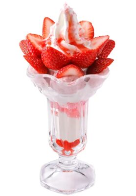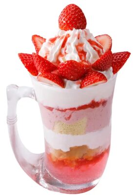 …完熟いちごを7粒使用し、いちごのマスカルポーネいちごゼリーの他、シフォンケーキ、ホイップクリーム、アイスクリームなどを大きなジョッキに詰め合わせた満足感のある一品です。