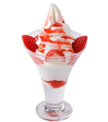…北海道ソフトクリームにいちごソースを絡めて完熟いちごをトッピングした、食後にぴったりな小さめサイズのデザートです。