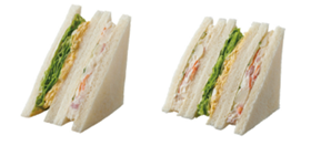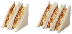 …従来品の「ポテトたまごサンド」と比較して、ポテトサラダを約50%増やして、3層のサンドイッチに。にんじん、玉ねぎ、ハムなどを使用したポテトサラダと、たまごサラダにレタスを組み合わせたサンドイッチです。