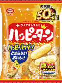 …従来品の「ハッピーターン 79g」と比較して、内容量を約50%増やしました。あまじょっぱいパウダーがクセになるおいしさです。
