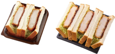 …従来品の「三元豚の厚切りロースカツサンド」と比較して、カツサンドの個数を約50%増量の3個入りにしました。厚切りのロースとんかつに、野菜と果実で仕上げたフルーティーな甘さとすっきりした後味が特長の特製ソースを合わせました。