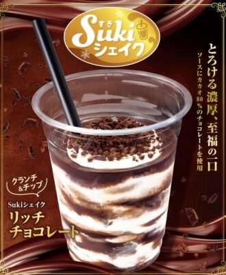 2月5日(木)よりすき家の一部店舗限定で、ソースにカカオ80%のチョコレートを使用した口どけの良いチョコシェイクに、サクサクのチョコクランチとつぶつぶとしたチョコチップの食感がアクセントになった「Sukiシェイク リッチチョコレート」が新発売されます✨