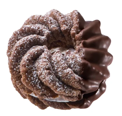 …ミルクチョコ風味のふわっと軽いショコラフレンチ生地に、ザクザク食感がアクセントのチョコクリームをサンド。仕上げにホワイトチョコをコーティングしています。