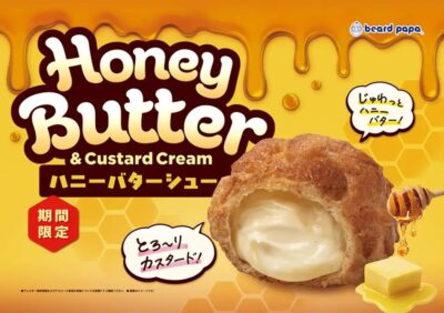 3月18日(水)よりビアードパパから、海外のビアードパパで大人気のハニーバターがしみ込んだ香ばしいシュー生地となめらかカスタードを合わせた「ハニーバターシュー」が新発売されます✨