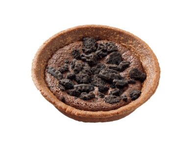 …ブラックサンダーをイメージしたチョコタルトです。ココアタルトに、チョコチップとチョコ生地を入れ、ココアビスケットをトッピングし、焼き上げています。