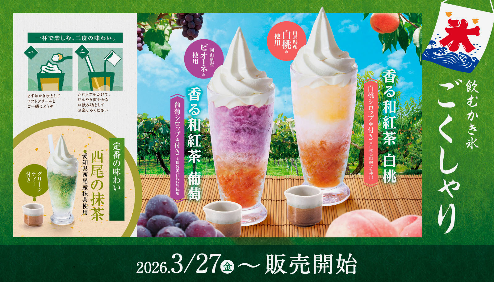 3月27日(金)よりコメダ和喫茶「おかげ庵」から、ソフトクリームにひんやり氷を合わせ こだわりの特製シロップを加えた、爽やかな飲むかき氷「ごくしゃり 香る和紅茶 白桃/香る和紅茶 葡萄」が新発売されます✨