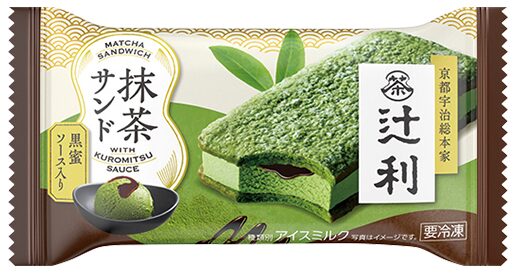 4月21日(火)よりファミリーマートから、京都宇治総本家「辻利」の抹茶を、ケーキとアイスに使用し、辻利抹茶の上質な味わいと黒蜜の組み合わせを楽しめるサンドアイス「明治 辻利抹茶サンド 黒蜜ソース入り」が新発売されます✨