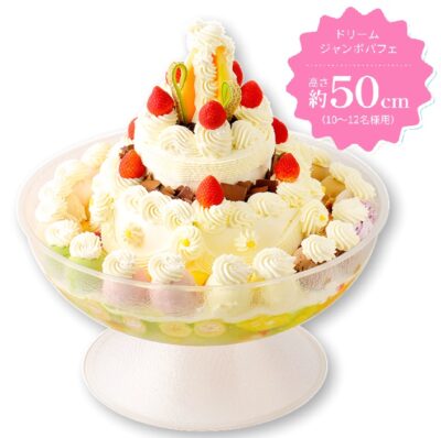 札幌駅近くにある雪印パーラー本店の、土台には寒天とフルーツをぎっしり敷き詰め、その上にはシフォンケーキ、イチゴ、ケーキが層をなし、周りにはアイスクリームを並べた10~12名様用の高さ50㎝「ドリームジャンボパフェ」(16,300円)✨