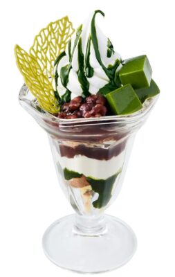 …青々とした新緑を表現した華やかなパフェ。店内仕込みのぷるんとした抹茶ゼリーや濃い抹茶ソース、店内で丁寧に焼き上げた繊細な葉脈の形をした抹茶リーフクッキーなど、祇園辻利の抹茶を贅沢に使用しています。スポンジケーキやマスカルポーネを折重ねることで抹茶ティラミスのような味わいや層の美しさも楽しめ、こっくりとしたあずきが抹茶のほろ苦さとマッチする贅沢なパフェです。